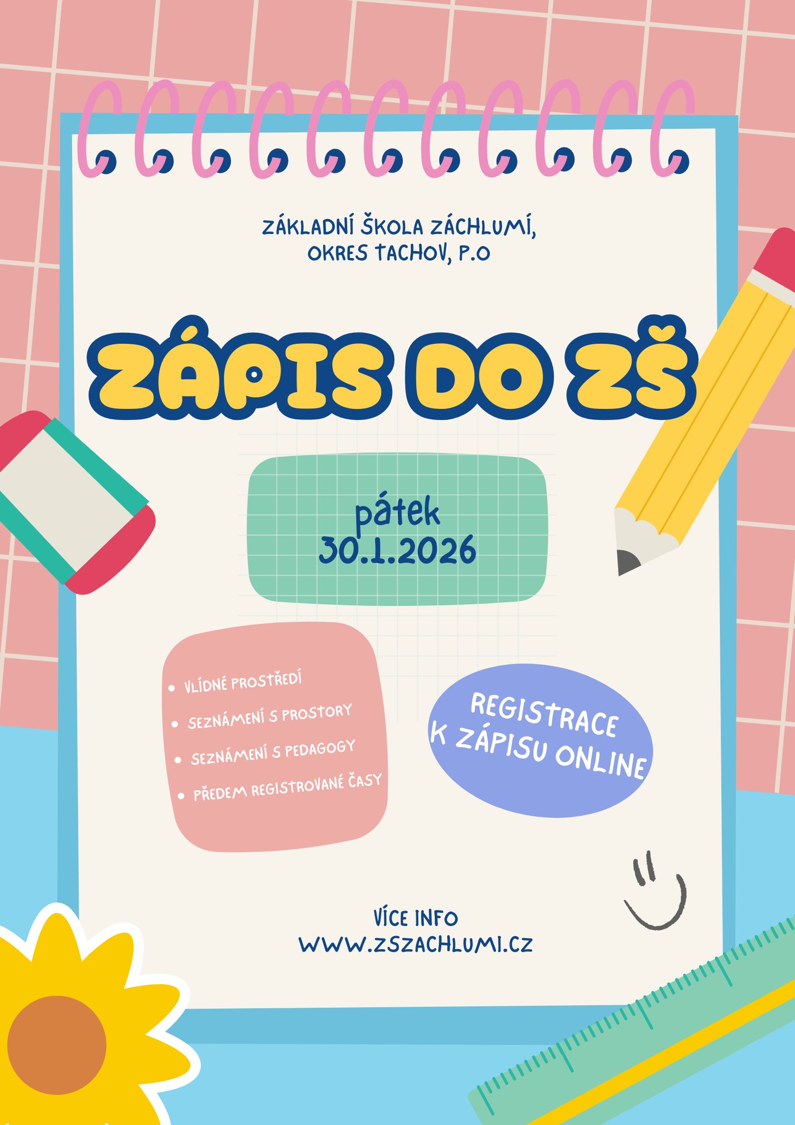 Veškeré informace týkající se zápisu do 1. ročníku ZŠ naleznete zde.